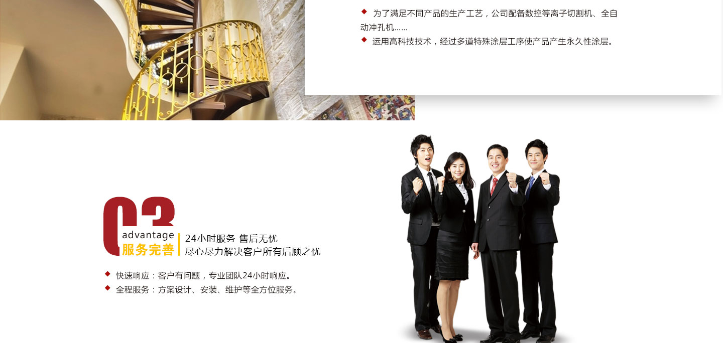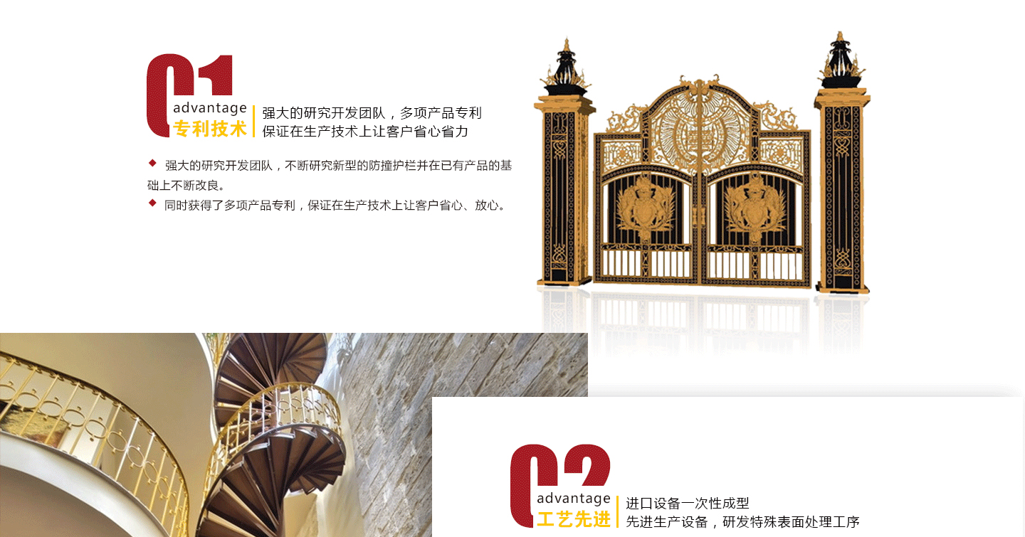 本公司專業定制鐵藝樓梯、旋轉樓梯、消防樓梯、鐵藝大門、鐵藝護欄、鐵藝防盜窗,金屬制品制作。以“客戶為本,求實開拓,永無止境”為奮斗目標,不管對客戶還是對公司員工,始終堅持雙贏的原則,致力于建立長期的合作關系。自公司成立以來,公司吸引了一批工程技術、銷售和客戶服務人才,我們堅信“客戶的信賴是企業的根本”,以產品和周到服務取信于各新老客戶,熱忱歡迎廣大客商光臨惠顧!